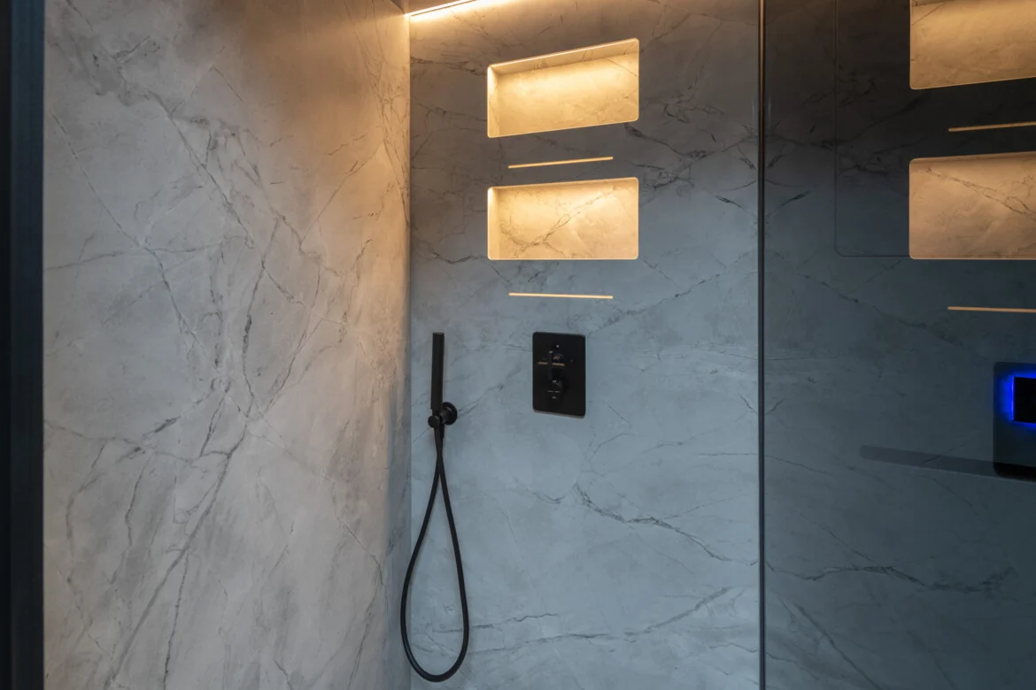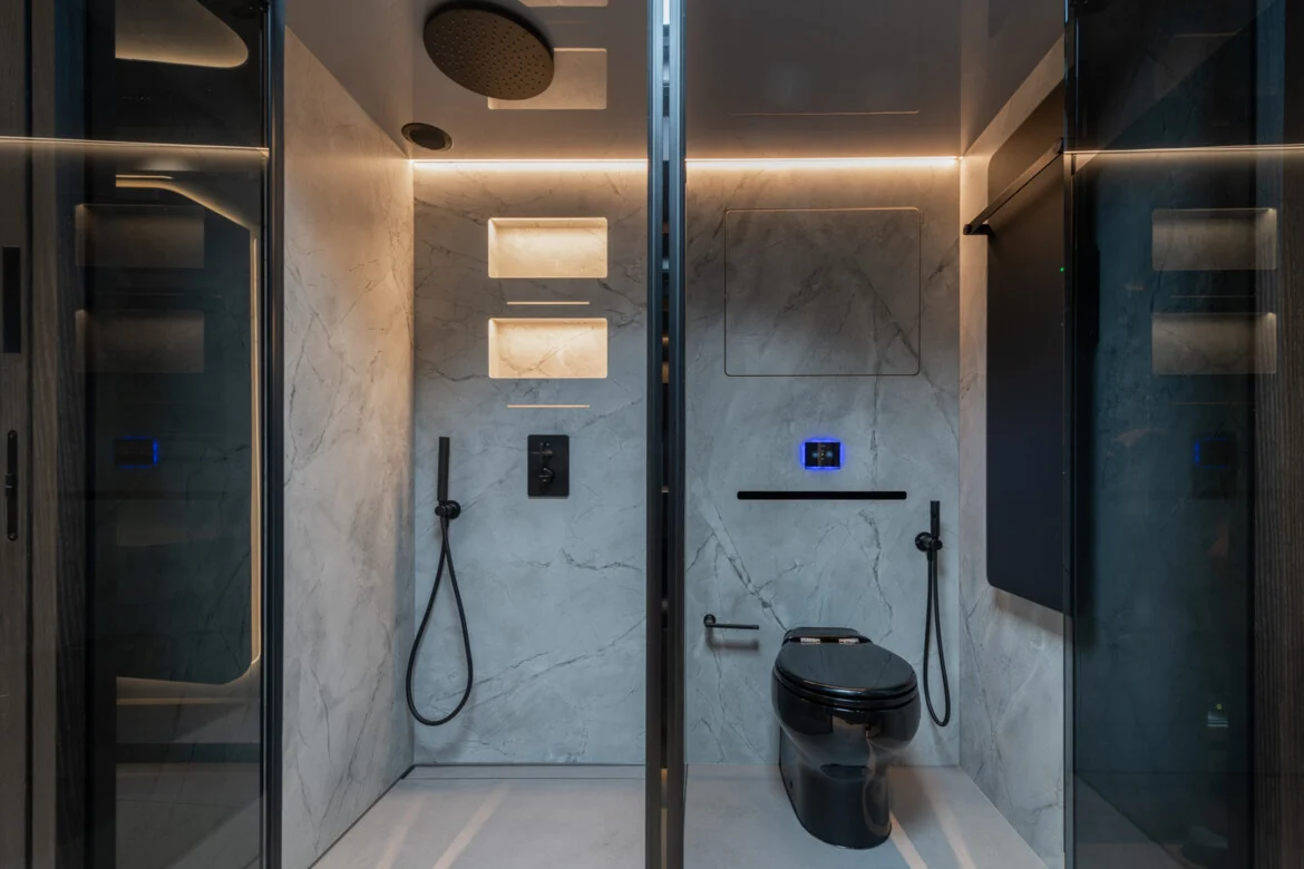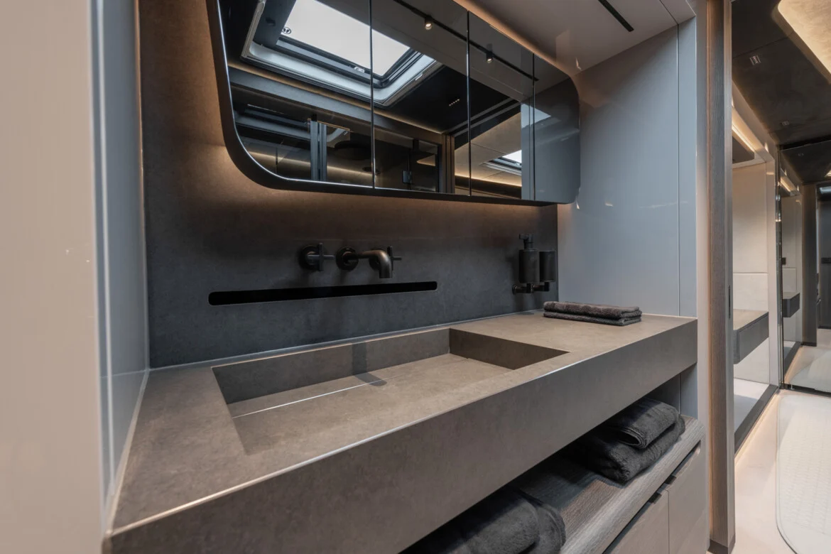 The saloon also features a modern kitchen with an induction hob, oven, dishwasher and spacious fridge with an integrated freezer compartment. A separate wine fridge and coffee machine are also available for drinks. The sofa opposite the kitchen, together with designer chairs upholstered in black and gray fabric and a large black table, can become part of a dining room. This ensemble can also be used as a comfortable workstation or a mobile office. Of course, there is also a luxurious bathroom in fine natural stone with a rainforest shower, WC and washbasin between the bedroom and living area.
