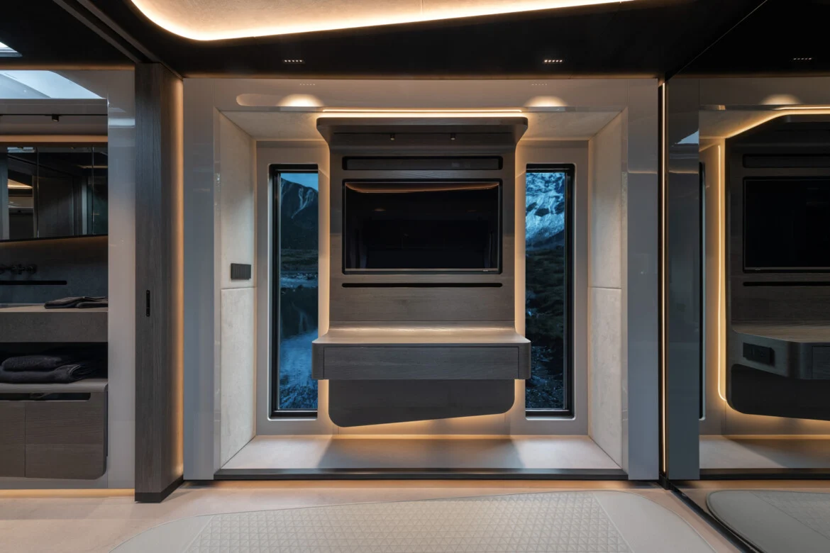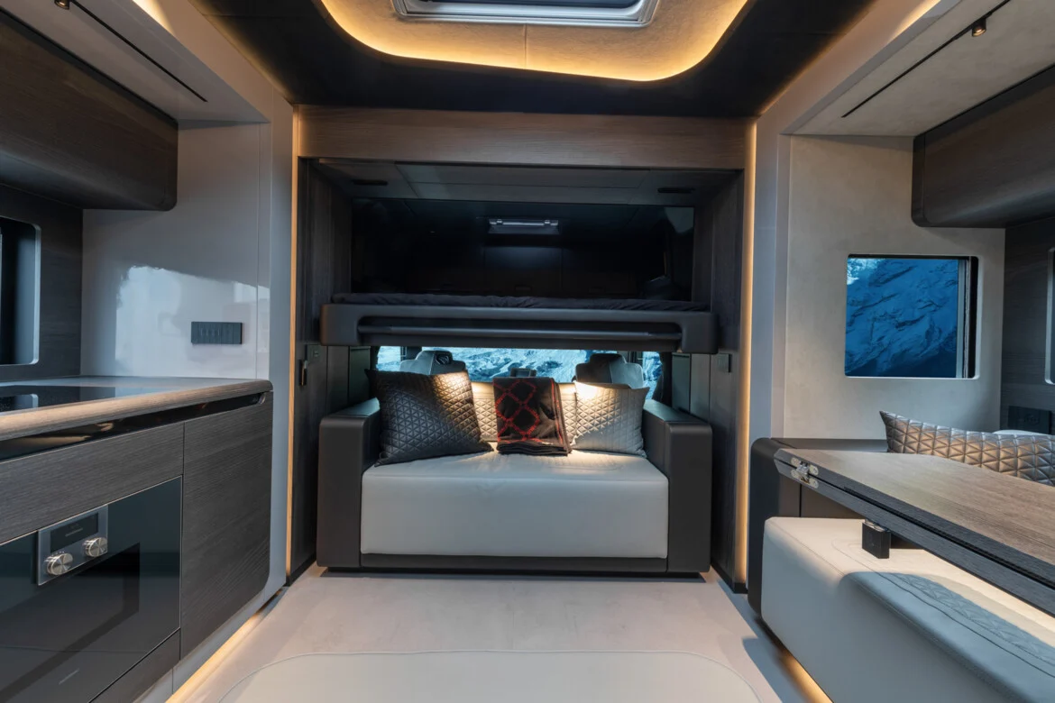 Two extendable modules in the sleeping compartment create space for the comfortable, transversely positioned double bed measuring 160 x 200 centimeters (63 x 79 in). A large closet is integrated into the rear wall of the motorhome. A desk and a 43-inch 4K television are installed in the side wall opposite the bed, which, like an identical device in the saloon, can be used to watch TV programs or play games on the integrated Playstation 5 system. Thanks to satellite internet via Starlink, passengers can watch streaming services, access content from the internet or communicate with the whole world, even in remote areas.